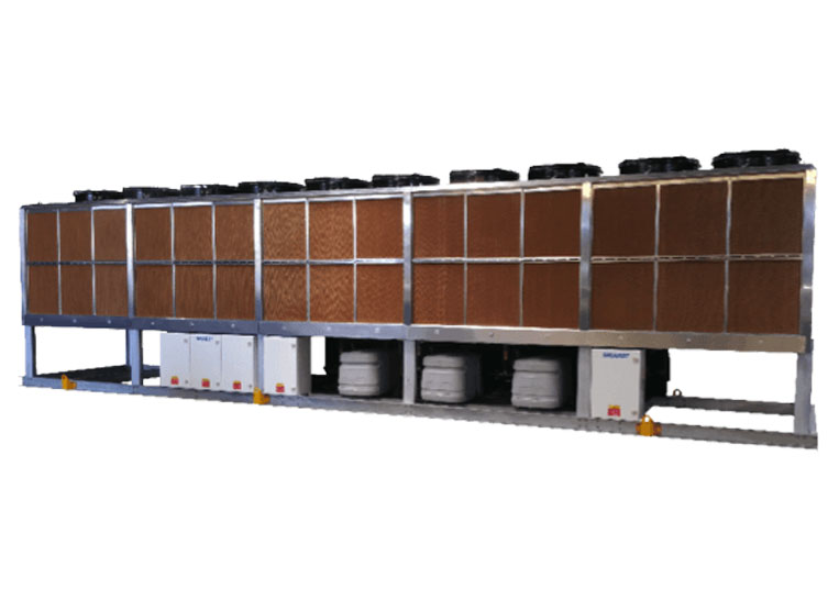 The E-Class chiller is Smardt’s adiabatic cooling system. Cross-fluted evaporative pads are situated on the outside of the coils. Separated from the coil surface, these pads are designed to be saturated with treated water, and the pads also provide protection for the coils.